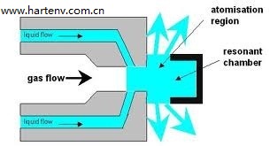 壓縮空氣高速通過噴嘴的過度導流孔,在超高的空氣速度下,收縮噴口使空氣加速至聲速,并產(chǎn)生高頻率的機械聲波,混合液滴,沖擊諧振器腔,霧化液滴。反射,擴增主沖擊波。聲波能量將被集中在噴嘴主體和諧振器上,一旦產(chǎn)生這種強大的沖擊波,水被剪切成相對的小水滴。這些小水滴進行激烈的聲能轉(zhuǎn)換后,變成數(shù)千微米級大小的液滴,在聲波音爆中被高速空氣霧化彌散。